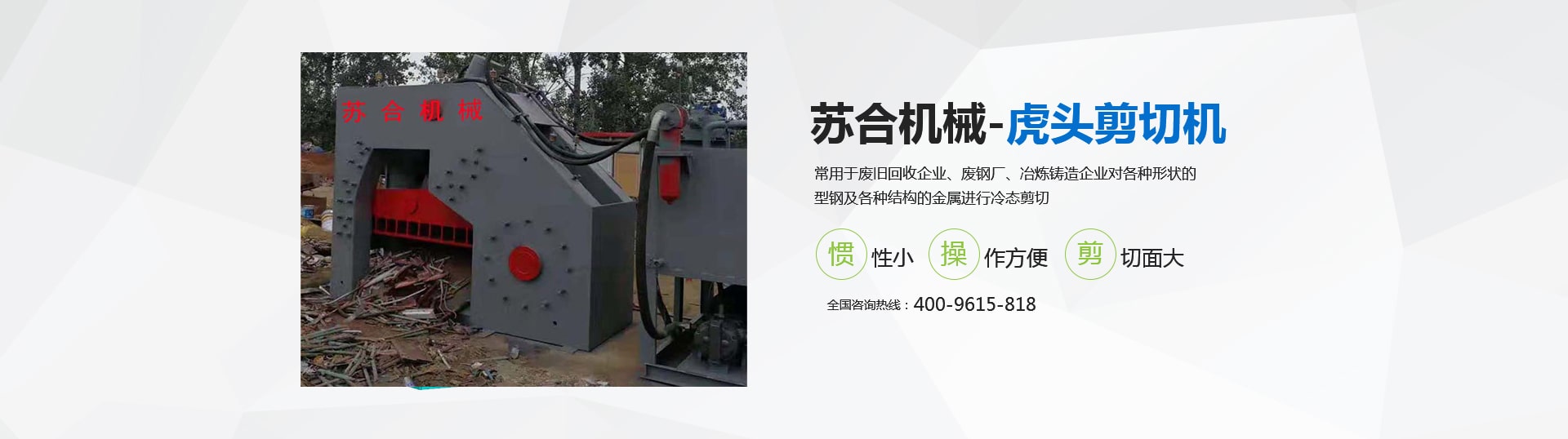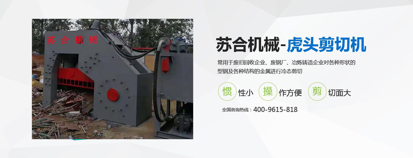 虎頭剪具有體積小、重量輕、慣性小、噪音低、動(dòng)作平穩(wěn)、操作方便、靈活、剪切斷面大、剪刀口調(diào)整方便等優(yōu)點(diǎn),操作使用安全。常用于廢舊回收企業(yè)、廢鋼廠、冶煉鑄造企業(yè)對(duì)各種形狀的型鋼及各種結(jié)構(gòu)的金屬進(jìn)行冷態(tài)剪切。剪切機(jī)的用途就是用來(lái)剪切定尺、切頭、切尾、切邊、切試樣及切除軋件的局部缺陷等。 滑縣蘇合機(jī)械制造有限公司性能穩(wěn)定,操作簡(jiǎn)單。歡迎來(lái)電咨詢(xún) <了解更多>